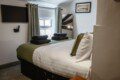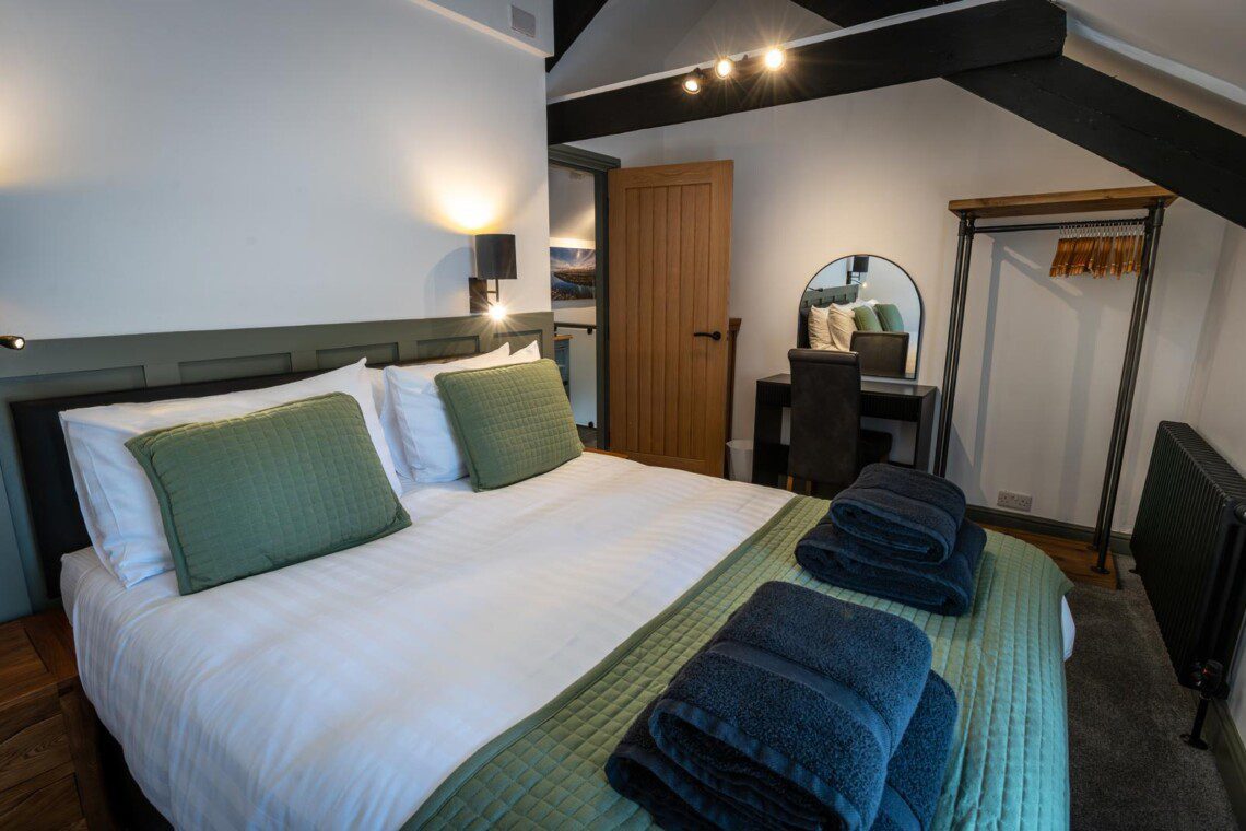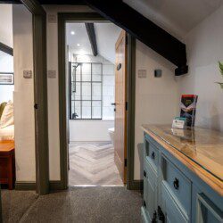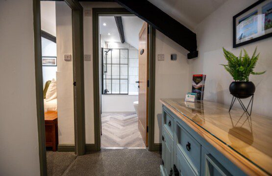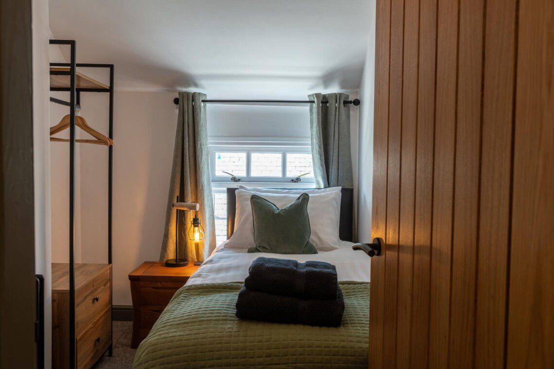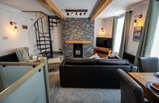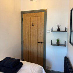 A feature spiral staircase leads up to a modern bathroom and two comfortable bedrooms- one king size and a single bedroom.